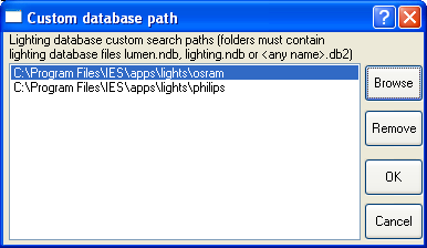 This dialogue box allows you to edit the list of custom paths (including UNC network paths such as "\\server\c\lighting\") that are searched for lighting database files. The system files (in the "lights" folder below the IES installation folder) and the project files (in the "lights" folder below your project folder) are loaded by default. The custom files are loaded according to the set of paths that you may edit here. You may make a particular set of paths always available by editing "autoexec.bat" to add a line beginning "set FLUCS=" followed by a list of folder paths, separated by semicolons, e.g.: