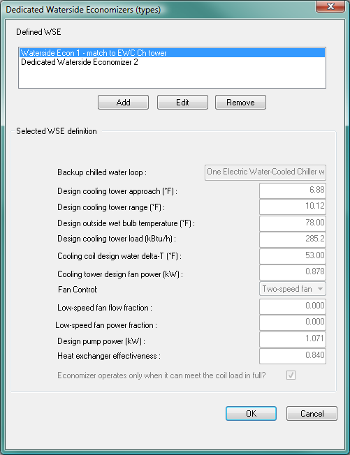 This facility allows you to define the characteristics of one or more dedicated waterside economizers directly coupled to a single cooling coil. This type of waterside economizer (WSE) can be associated with a backup chiller and is limited to running only when it can meet the load in full.