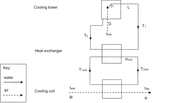 ε coil and ε tower are in the ratio of the flows in the coil and tower loops. The heat exchange effectiveness parameter is thus the smaller of these two effectivenesses.