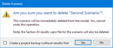 There is also a checkbox at the bottom-left to allow a project backup archive to be created prior to the deletion – this option is unchecked by default. Note that this archive will not include any results file for the scenario.