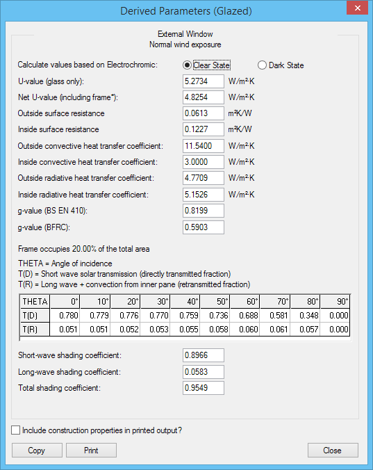 Calculate values based on Electrochromic Clear State/Dark State: this option is only displayed if the construction includes an Electrochromic Glazing layer – it allows you to choose whether to display the optical properties based on the clear or the dark state of the glazing (the radio controls default to “Clear State”).