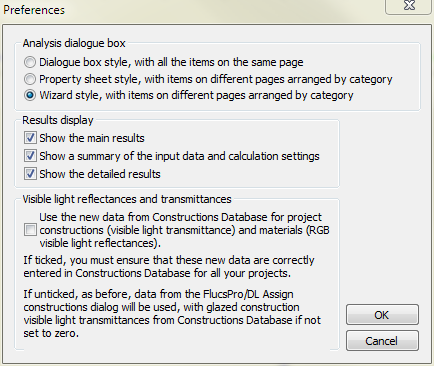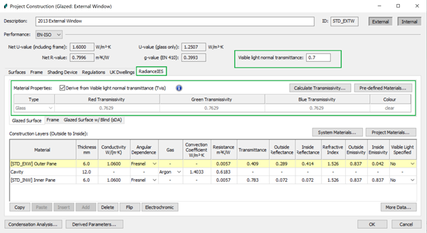 When this option is ticked then the assigned properties in the Flucs interface are ignored and instead the Reflectance and Transmittance values on the Constructions assigned to the model are used in the calculation. These are specified via Constructions Database on the RadianceIES tabs for internal and external surfaces
