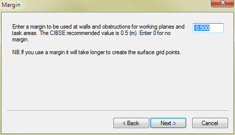 Enter the margin to be left uncalculated at the edges of working surfaces. Because the grid size is constant, the calculations will be inaccurate when the working surface is close to a room surface. The CIBSE-recommended margin is 0.5m.