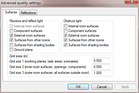 You may specify various calculation settings, including the sizes of the calculation grids, whether to check for obstructions, whether to include component surfaces as reflecting or obstructing components, and inter-reflection calculation method.