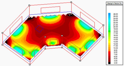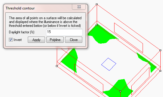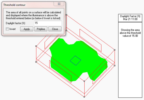 This is displayed when you select the Threshold table menu option or button. The values displayed depend on whether you are currently displaying illuminances or daylight factors, and also on the threshold value in the Daylight Threshold dialogue box.