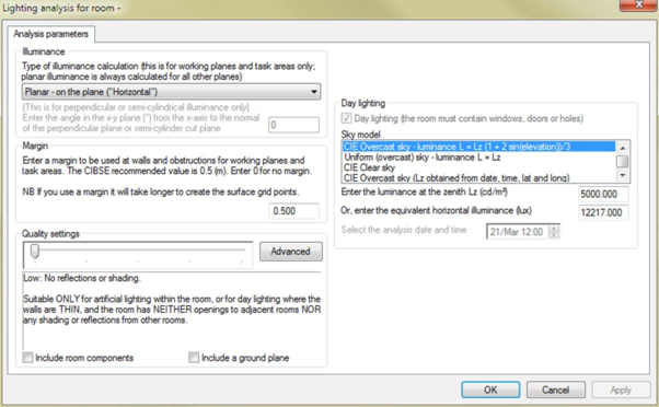 Select this to calculate day lighting from all the external openings within the room. External reflections, including ground reflectance, or external obstructions, may be included if you select the correct quality settings.