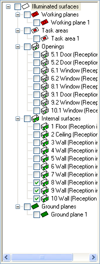 Select the surfaces that you wish to be included in the calculation as surfaces that receive light and can therefore also be included in the inter-reflection calculations.