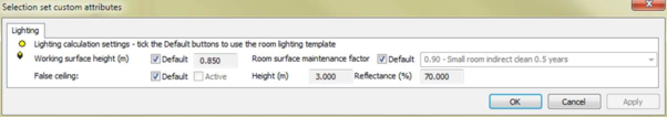 This is displayed when you use the tool to modify the attributes for the selected rooms. It uses the same Lighting page as is used on the FlucsDL dialogue bar. Use it in the same way to override the default attributes of all the selected rooms.