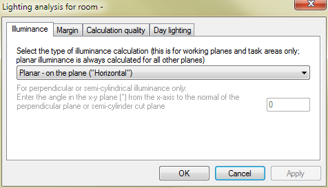 Specify the type of illuminance to calculate for working planes and task areas. Note all other surfaces always use Planar illuminance: