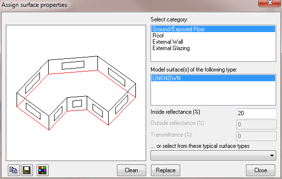 Only enabled for glazed elements. Enter the required transmittance or select it from the typical surface types list box and press the Replace button.