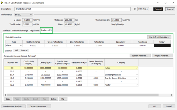 For Opaque surfaces the RGB values can be specified directly via the RadianceIES tab >> External and Internal sub tabs: