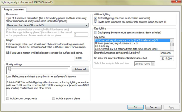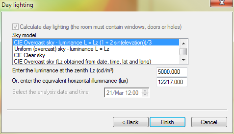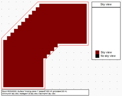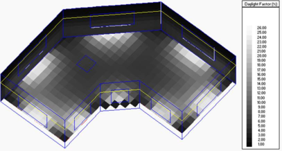 This is displayed when you select the Threshold table menu option or button. The values displayed depend on whether you are currently displaying illuminances or daylight factors, and also on the threshold value in the Daylight Threshold dialogue box.