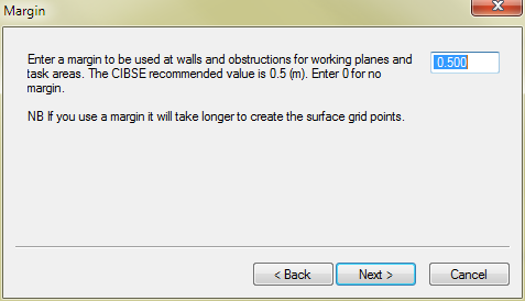 Enter the height of the working surface in metres. This is an imaginary horizontal plane with a required average illuminance that is to be achieved by the selection of suitable lighting layouts in the design calculation. It is also used in the analysis calculation when creating the default working plane.