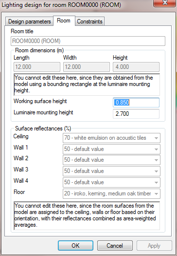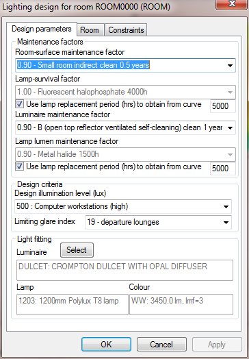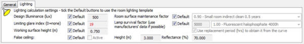 This page is only shown in single-room mode. It allows you to confirm the design criteria for the FlucsPro design calculations. Most of this data is derived from the room geometry or from data entered already elsewhere in FlucsPro or LightPro, so should only be changed for a good reason.