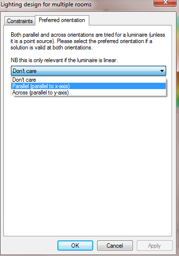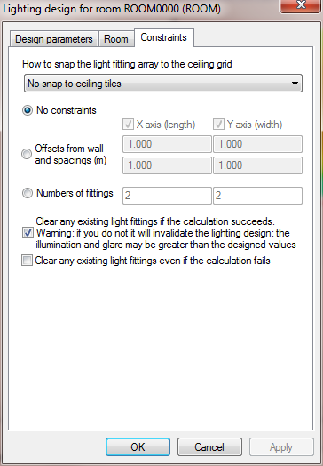This page is shown in both single-room and multi-room modes. It allows you to select how the light fittings being designed will snap to the ceiling grid. They may be snapped to the nearest ceiling tile intersection, snapped to the nearest ceiling tile centre, or not snapped at all. If you wish to constrain the light fittings to a ceiling grid, it is best to use this combo and none of the further constraints below.