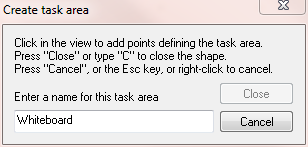 This is displayed when you use the tool to create a task area in a room surface or in a working plane at surface level. Enter a name for the task area and start specifying points by clicking in the viewport or using key-ins. When you have specified at least three points defining the task area, you may press the Close button or type “C” to close the shape and finish. You may cancel at any time by pressing the Esc key or right-clicking with the mouse.