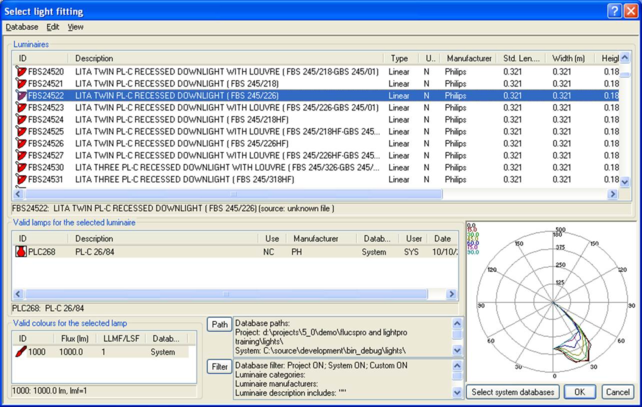 This dialogue box allows you to select a luminaire, lamp, and colour from three list views. When a luminaire is selected, the list of lamps is automatically updated to show lamps that are valid for the luminaire, and the polar curve is displayed. Similarly, when a lamp is selected, the list of colours is automatically updated to show colours that are valid for the lamp. The column headers may be clicked to sort on the property listed in that column. Menus are provided for database activities (database path and filters commands, saving the database, importing and exporting CIBSE, EULUMDAT or IESNA data, etc.) editing activities (add, properties, delete, database calculations) and changing the list view types.
