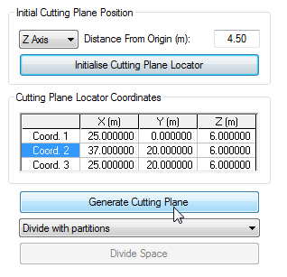 You can either manually type in the co-ordinates of the cutting plane or you can click on the tool at the top of the box (get locator co-ordinates from space vertex tool) then click and drag (holding the left mouse button) the three corner points of the cutting plane in the model space to position it as shown in the diagram on the next page