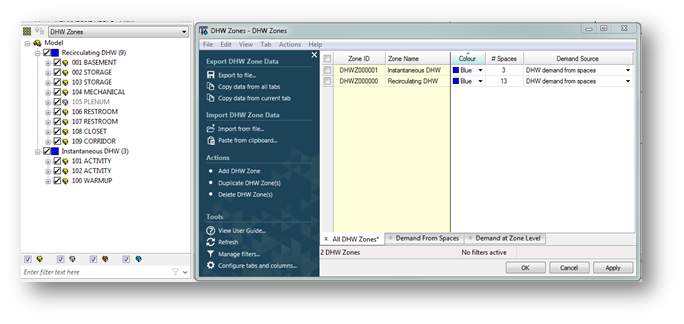 For each DHW Zone, domestic hot water demand can be defined as either the sum of the demand from the spaces within that zone, or as a user-entered demand for the DHW Zone. When the demand is determined by the spaces, the DHW Zone inherits the collective DHW demand from the constituent spaces. When the demand is set at the DHW Zone level, any DHW settings in the constituent rooms will be overridden. Instead, a DHW Consumption value and DHW Pattern of Use Profile will be defined in the DHW Zones dialog.