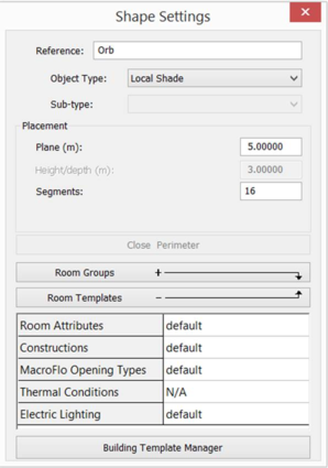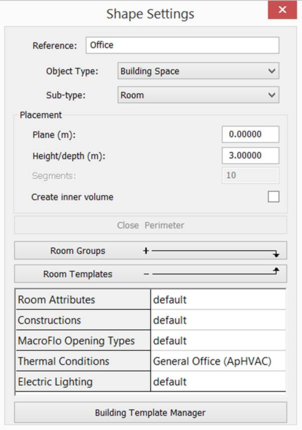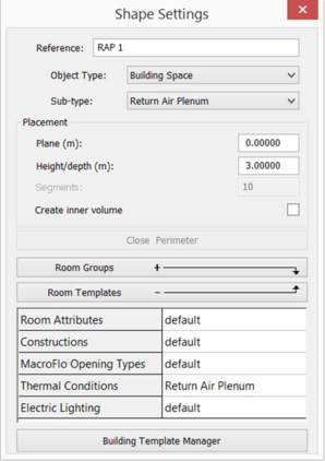 Room Templates allows you to specify templates which will be assigned to the new space. In the case of Thermal Conditions, the assignable templates are those whose sub-type match that of the space. (If the sub-type is subsequently changed, a template with a matching sub-type will be assigned automatically). The Thermal Conditions template assigned to a room specifies (inter alia) the room’s HVAC methodology.