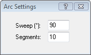 The "Sweep" setting is used to define the sweep angle (in degrees) of the arc, a positive value for a clockwise sweep and negative for an anti-clockwise sweep. The "Segments" setting is used to define the number of straight-line segments used to create the arc. The accuracy of the arc may be improved by increasing the number of segments. However, the greater the number of segments, the longer the processing times will be. When you move the cursor back into the model window, you will see a small circle attached to the cursor. This circle is used to define the centre of the arc. When the arc is placed, you may place another arc, or press the right mouse button to continue drawing the extruded shape or ‘unwind’ the arc segment by segment by repeatedly pressing the right mouse button.