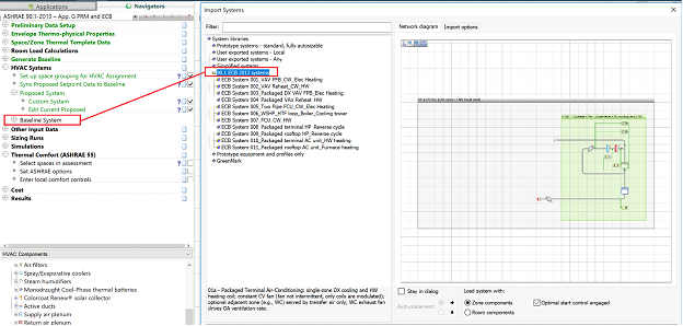 Action: Autosized prototype systems have been developed with reference to table 11.5.2-1 to accommodate the ASHRAE 90.1-2013 ECB HVAC Systems. When the “Edit current Baseline” navigator workflow is selected the relevant ECB budget system should be selected from the “ECB systems” prototype library.