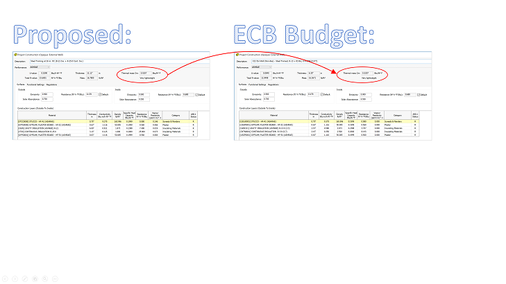 See example below with proposed wall vs. the automatically generated and automatically assigned ECB Budget wall constructions. Note varying U-values and differing Thermal Mass.