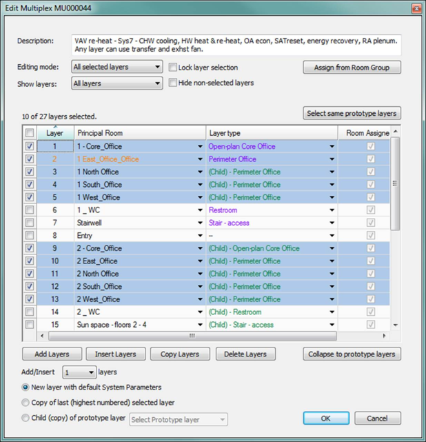 Global edits to room units within a multiplex apply to the currently selected room unit and those in other selected layers that are of the same type and position within the ordered list of units of that type (if such a room unit exists in the rooms on the other layers). Clicking OK in a Room Unit controller when in Global Edit mode will apply not only newly edited values but ALL inputs and settings in that dialog to all corresponding room unit controllers.