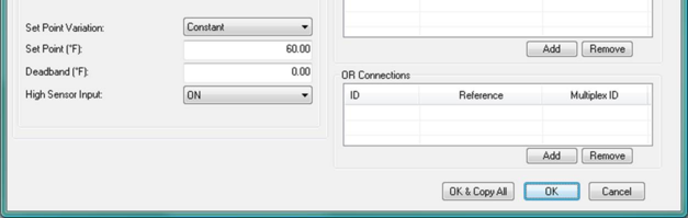 Figure 5 - 5 : In Global Edit mode there are two OK buttons for multiplexed Room unit controller dialogs, as shown here. OK & Copy All replicates the data in all the controller fields on the display layer to controllers for corresponding room units on other currently selected layers, whereas OK replicates only the data that has just been modified and not yet saved.