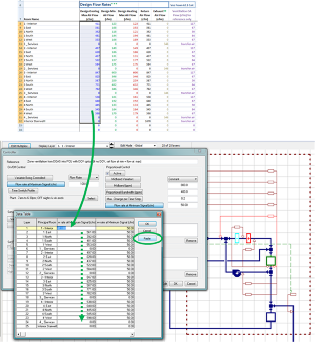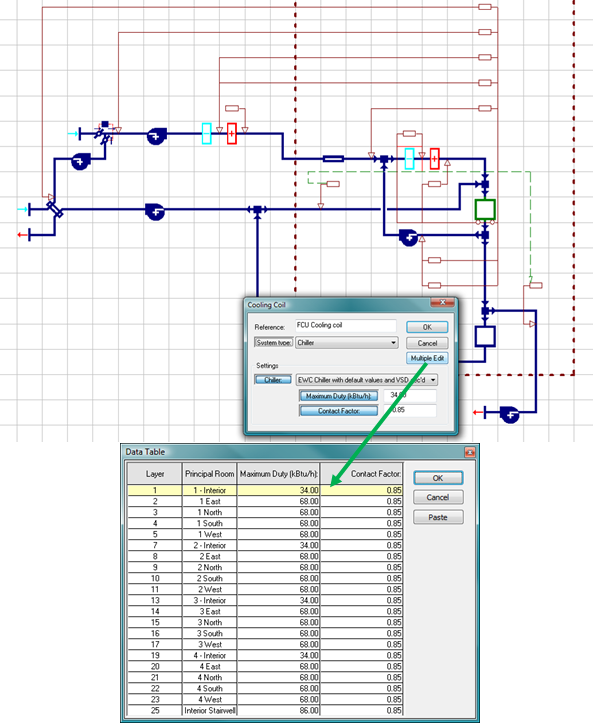 Tabular Editing allows input values for components and controllers on all layers to be reviewed or edited in a data table format. When in Global Edit mode with more than one layer currently selected, open the properties dialog of any controller or component then select the variable to be edited. This is not yet supported for Room Unit controllers.