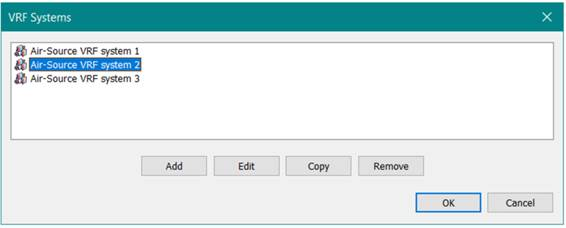 The Add button creates a new VRF system with default settings. The Edit button opens the VRF system dialog for the selected VRF system in the list. The Copy button copies the selected VRF system and adds it to the list as a new VRF system with a unique name. The Remove button deletes the selected VRF system, unless the VRF system is assigned to a VRF indoor unit through a heating or cooling coil. The Cancel button annuls any updates made within the VRF Systems dialog and closes the dialog. The OK button applies any updates made within the VRF Systems dialog to the current HVAC network and closes the dialog.