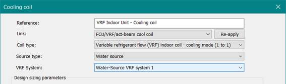 For each refrigerant loop in a VRF system design, that is for each set of refrigerant piping, a unique VRF system should exist in ApacheHVAC. For example, a project with three outdoor units serving different instances of indoor units should be represented in ApacheHVAC with three VRF systems as shown in Figure 3-129, above. Indoor units are then assigned to these VRF systems within the heating and cooling coil dialogs, as shown below for a cooling coil: