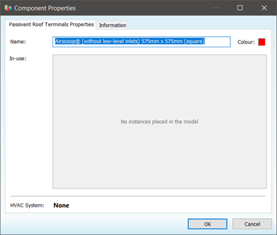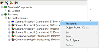 Once you have imported roof terminal components from the library, and before insertion into the model, component details can be viewed and edited to set design setpoints etc.