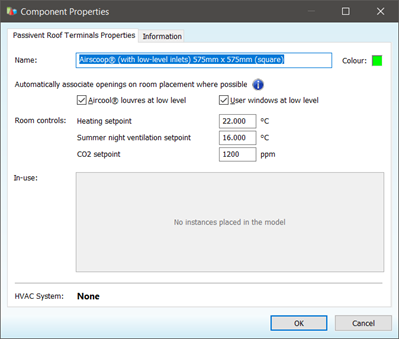 The Properties tab allows you to edit the component name, where possible louvres and windows should be automatically identified when applied to a room, edit terminal controls operational setpoint and to see if the component is in use in the model.