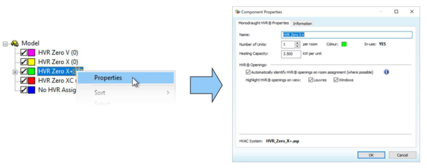 You can view and edit the HVR properties for each unit group (excluding the No HVR Assigned group) by right-clicking on the group item and selecting Properties. This will display the Component Properties window, consisting of two tabs: Monodraught HVR® Properties and Information.