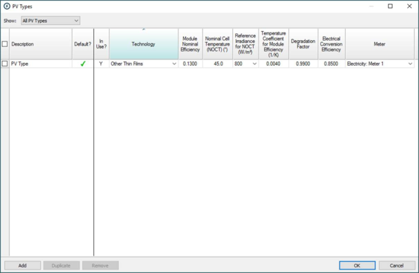 Define which PV Type is the default. Selecting a type included in the table will populate the data grid on the right with the corresponding data relative to that type.