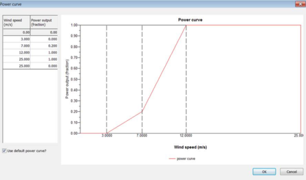 The power curve is defined as output power, here expressed as a fraction of rated power, as a function of wind speed. The first point on the power curve, which is uneditable, is (0,0). The second point indicates the cut-in wind speed – the wind speed at which the generator will start to generate power. The power output at this point is uneditable at the value zero.