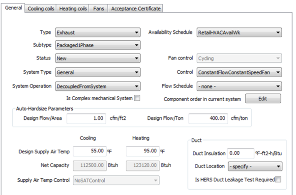 · System Operation: Describes whether exhaust system availability control is interlocked with the HVAC system availability. For compliance analysis, exhaust fans are assumed to have the same availability schedule as the ThermalZone's ventilation system, but does not night cycle. Options available are DecoupledFromSystem and CoupledFromSystem.