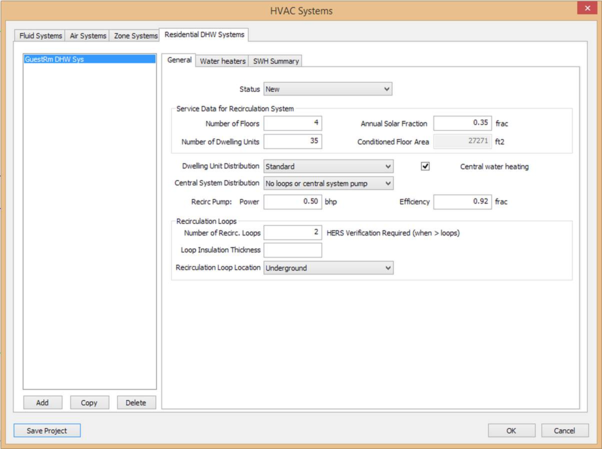 · Dwelling Unit Distribution: The type of ResidentialWater heating system. Options are Standard,Pipe Insulation All Lines,Parallel Piping, Recirculation options and Water heating system with HERS requirements.