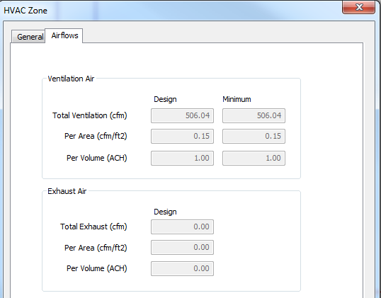 · Total Exhaust (cfm) : The design exhaust air flow rate in cfm for the thermal zone.