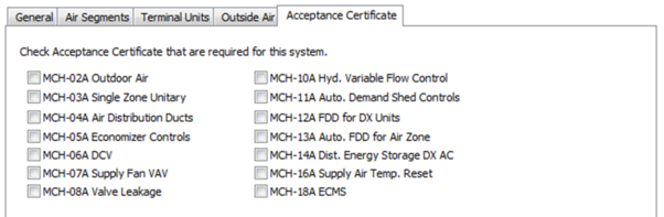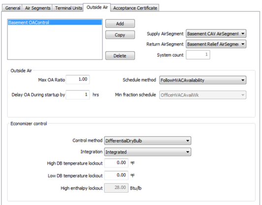 · Max OA Flow (For individual systems, not total if # of systems>1): The maximum ratio of outside air that a system can provided, defined as a percentage of the design supply air. Applies to systems with modulating outside air dampers. Economizers for smaller systems (<54,000 Btu/h) are assumed to have a restricted intake capacity