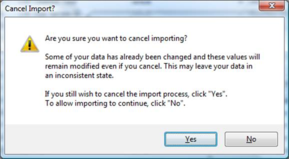Click No in this warning message to allow the import process to continue. Once the import has completed, the progress box will close automatically.