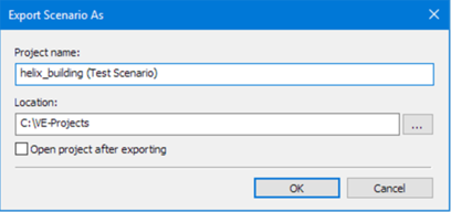 It is possible to export the active scenario as a new VE project – this allows it to function as a standalone VE project, no longer connected to its original source project. To export, select the Export “<scenario name>”… menu item from the Scenario dropdown. This will display a window that will prompt for the project name and the location to export it to (a directory matching the project name will be created at that location). There is also a checkbox that allows the exported project to be automatically opened once exported – this is unticked by default.