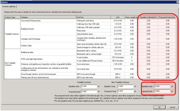 Input surface areas for both the proposed & baseline models. The resultant exterior lighting load will be calculated & assigned to the last room on the model. Exterior lighting is controlled using a default formula profile that simulates a photo cell switch. See ASHRAE 90.1 Section 9 for further exterior light details.