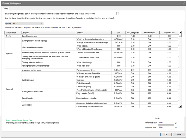 The user has the option to confirm that the exterior lighting meets part 4 prescriptive requirements and exclude it from the energy simulation