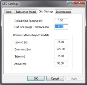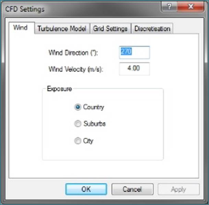 This tab on the CFD Settings dialogue lets you input all the settings related to the wind.