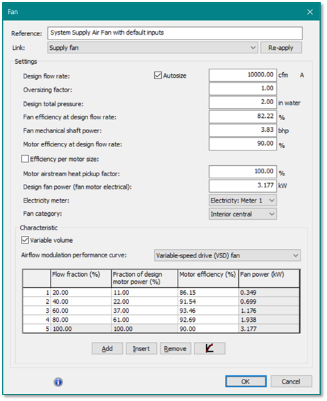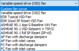 For constant-volume fan systems, the inputs above are all that’s needed. The Variable volume checkbox enables the additional user interface for selecting, editing, and viewing fan performance curve data.