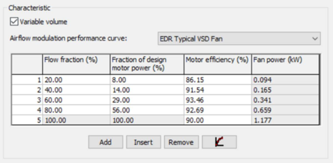 *Note: For the newer fan curves with 11 data points (VE2021 and onward), the data point at 0.01% flow simply provides a non-zero flow fraction to support the derivation of a fan power value at that is effectively zero flow, whilst avoiding a divide-by-zero error. This allows for interpolation of fan power values between zero flow and the smallest flow fraction data point in the data table. In most systems, however, the airflow will be constrained to a minimum operating fraction that is greater than or equal to the minimum flow fraction set in the fan curve data.