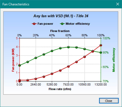 · Fan power (kW) is calculated for each flow fraction using all of the same parameters as noted above for the Design fan power.