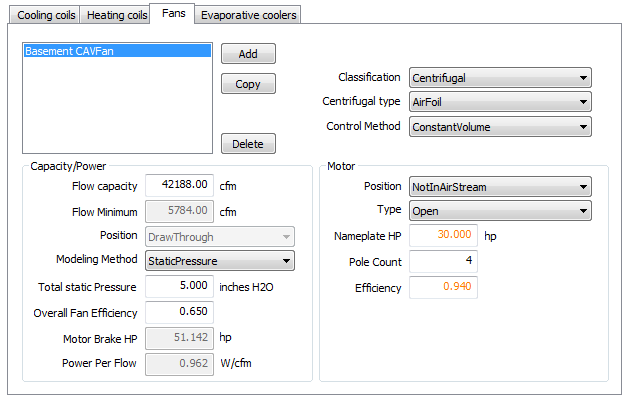 · Modeling Method : The method used to describe the design power consumption of a fan. Software commonly models fans in three ways. The simple method is for the user to enter the electric power per unit of flow (W/cfm). This method is commonly used for unitary equipment and other small fan systems. A more detailed method is to model the fan as a system whereby the static pressure, fan efficiency, part-load curve, and motor efficiency are specified at design conditions. A third method is to specify brake horsepower at design conditions instead of fan efficiency and static pressure. This is a variation of the second method whereby brake horsepower is specified in lieu of static pressure and fan efficiency. The latter two methods are commonly used for VAV and other larger fan systems.